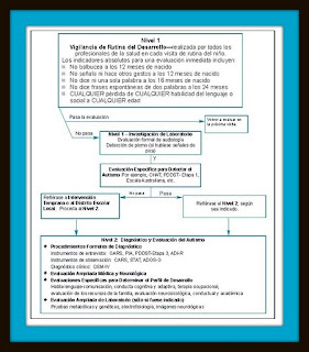 R: A continuación se muestra un diagrama de flujo general que describe el proceso sugerido para la detección y diagnóstico. Para una descripción más completa, por favor consulte a los Parámetros de Práctica de la Academia Americana de Neurología/Sociedad de Neurología Infantil (Filipek y colegas 2000).